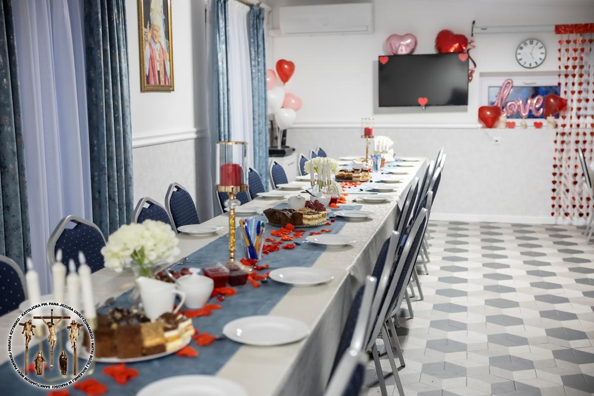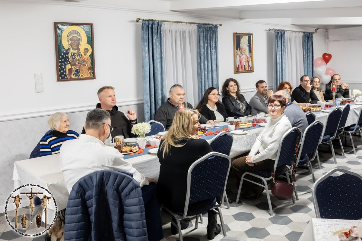 Po Mszy Świętej wszyscy małżonkowie zostali zaproszeni do sali Jana Pawła II, gdzie przy kawie i słodkim poczęstunku mogli dalej świętować w gronie innych par. Spotkanie upłynęło w serdecznej atmosferze, z rozmowami, konkursami i zabawami, które wniosły wiele radości i uśmiechu. Był to piękny czas umocnienia relacji, wdzięczności i wspólnoty. Serdecznie dziękujemy wszystkim małżonkom za obecność, wspólną modlitwę i radosne świętowanie.
