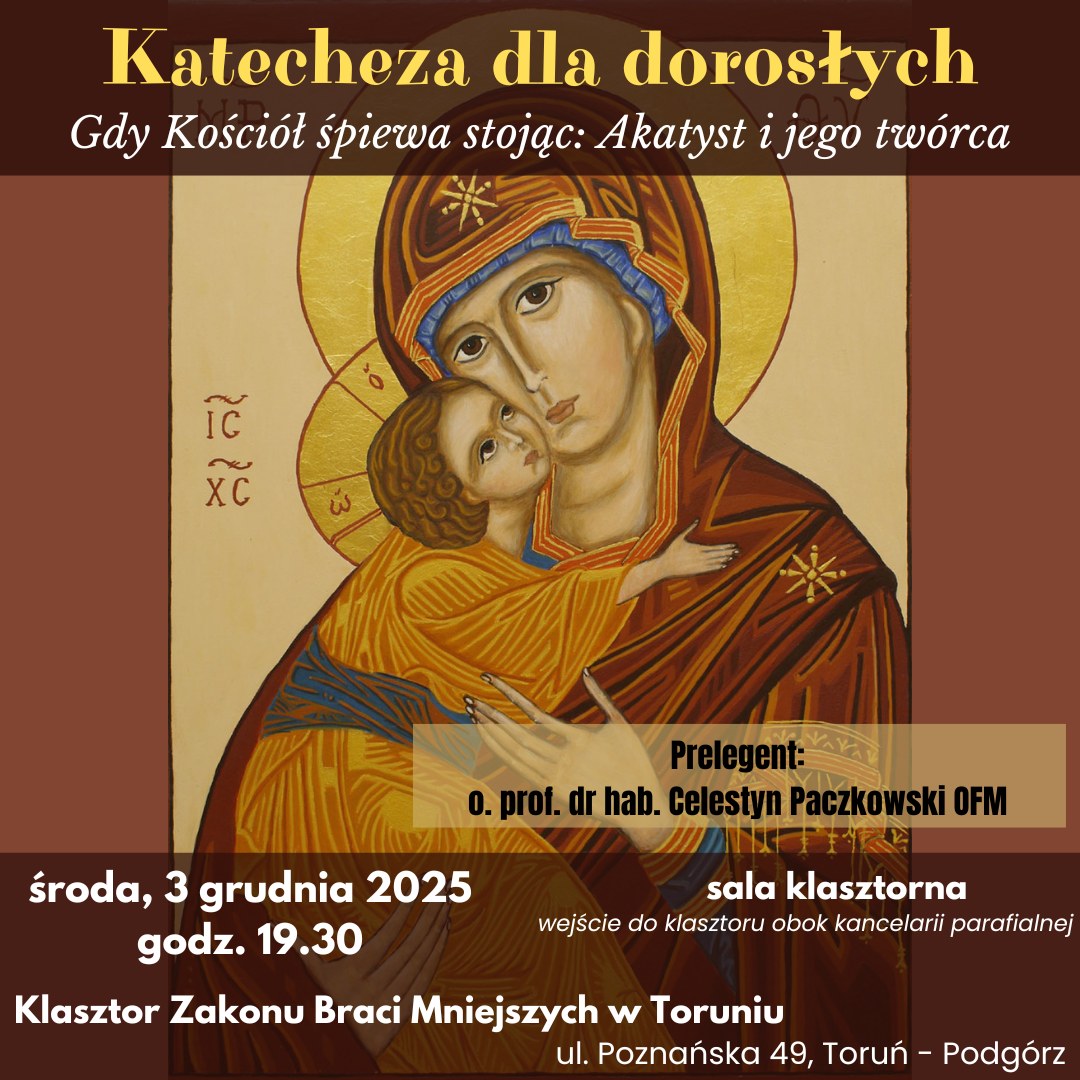 Katechezę wygłosi o. prof. UMK dr hab. Celestyn Paczkowski OFM, pt. „Gdy Kościół śpiewa stojąc: Akatyst i jego twórca”.