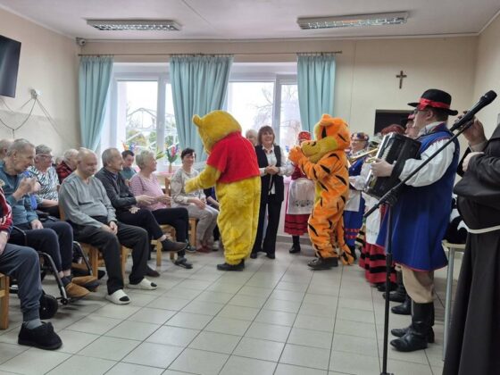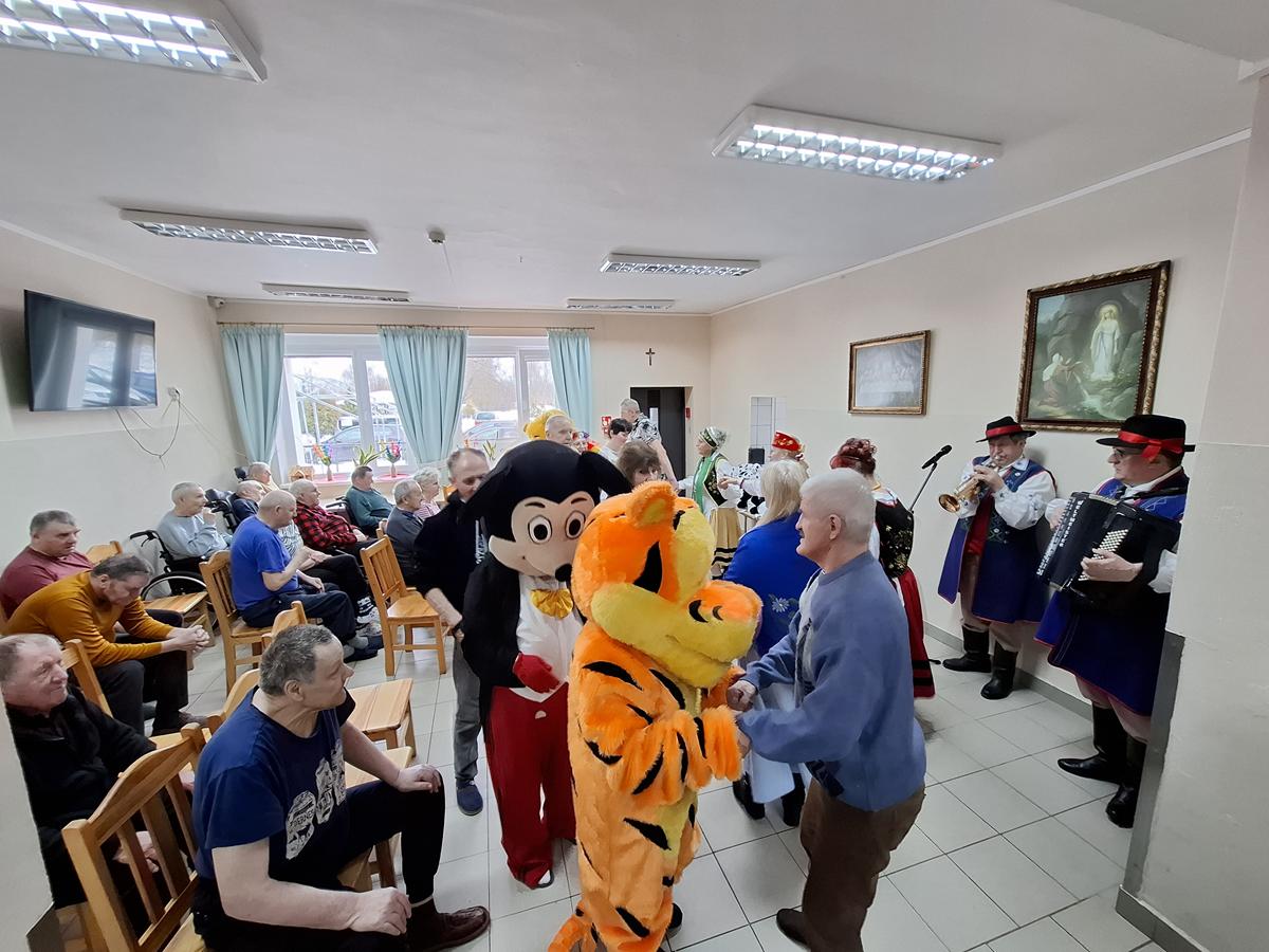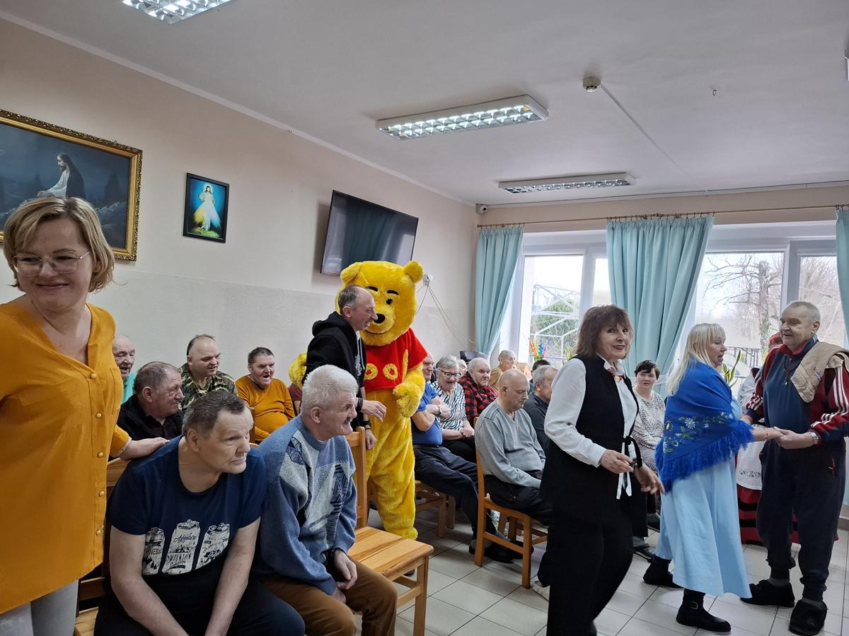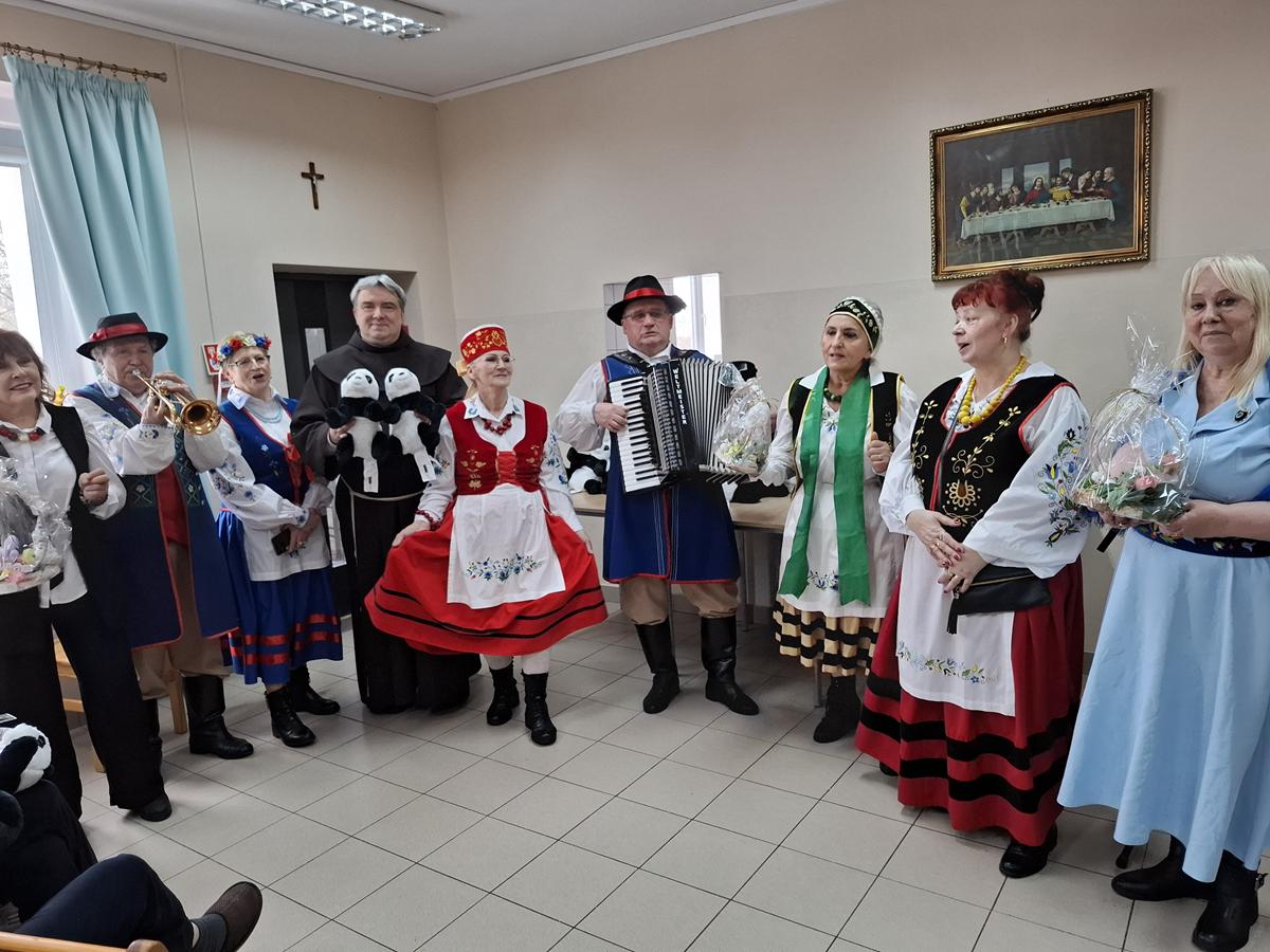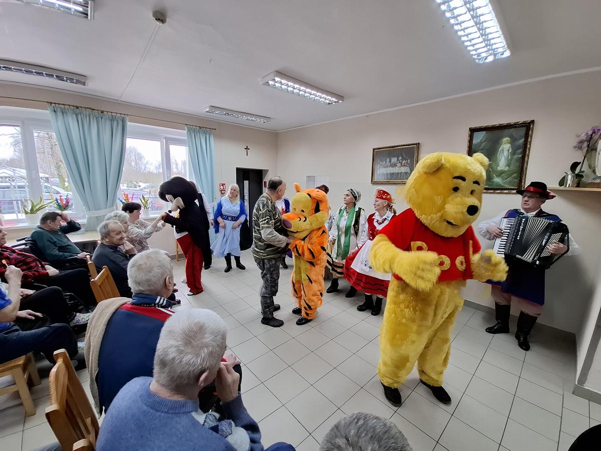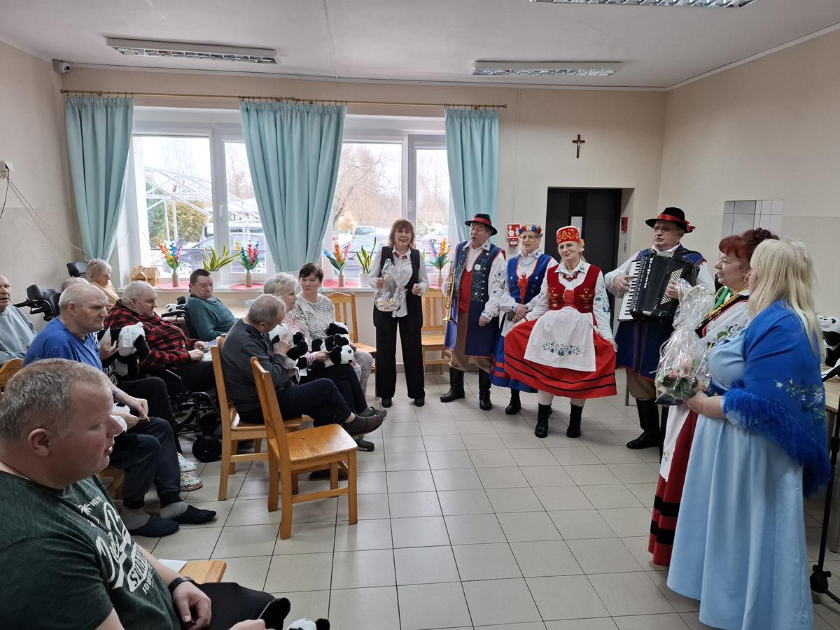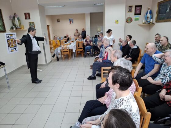 Po wprowadzeniu rozpoczęła się część artystyczna, przygotowana zarówno dla pensjonariuszy, jak i dla personelu placówki. Na początku wystąpili muzycy Kazimierz Maszk i Andrzej Lelek, którzy nie tylko śpiewali, ale również grali na akordeonie i trąbce. Artyści szybko rozśpiewali publiczność, słuchacze chętnie włączali się w wykonywanie znanych pieśni maryjnych i piosenek ludowych. Następnie wystąpił iluzjonista Paweł Czaja. Sztukmistrz zapraszał pensjonariuszy oraz opiekunów na scenę, by wspólnie z nim „wyczarowywali” różne przedmioty. Nie zabrakło także występu grupy taneczno-choreograficznej w składzie: Teresa Koszałka, Helena Kaszubowska, Regina Hirsz-Rompa, Mariola Karpiesiuk, Jagoda Wolska, Ewa Repińska, Elżbieta Plata, Józef Koszałka i Marcin Browarczyk. Podczas spotkania pojawiły się również postacie ze znanych bajek Myszka Miki, Kubuś Puchatek i Tygrysek, które wywoływały uśmiech na twarzach wszystkich obecnych. W role bajkowych bohaterów wcielili się członkowie grupy artystyczno-teatralnej. Program wzbudził wśród pensjonariuszy wiele radości i wzruszeń.