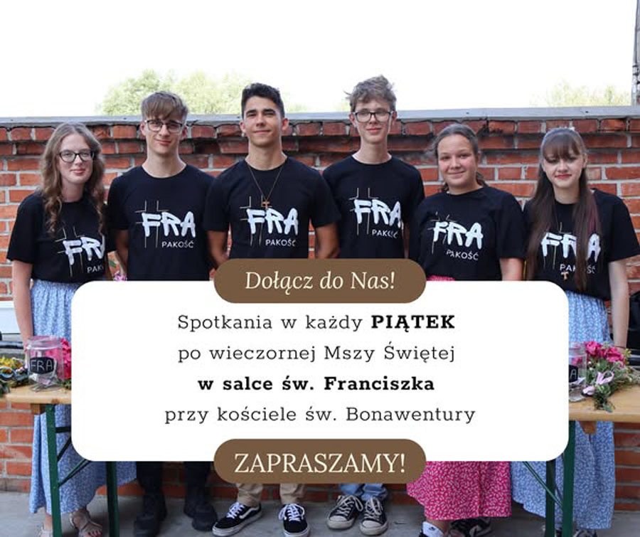 Spotykamy się w każdy PIĄTEK po wieczornej Mszy Świętej. W salce św. Franciszka przy kościele św. Bonawentury w Pakości