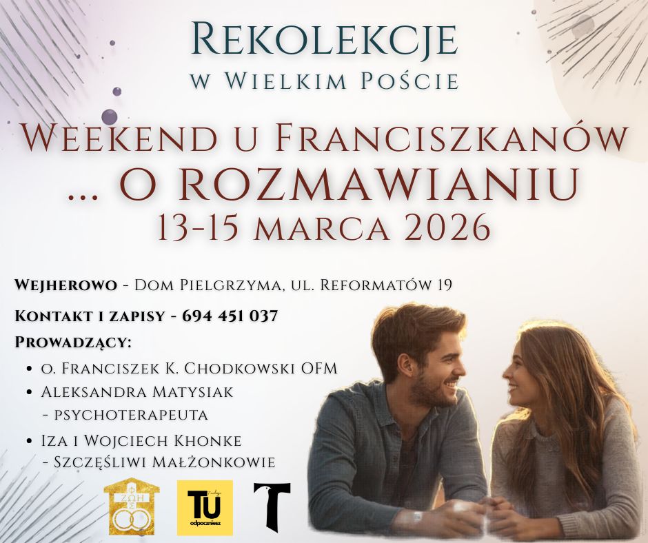 Serdecznie zapraszamy Was w dniach 13-15 marca na Rekolekcje w Wielkim Poście. Rekolekcje odbywać się będą w Domu Pielgrzyma w Wejherowie. Tematem Rekolekcji jest „sztuka rozmawiania”.