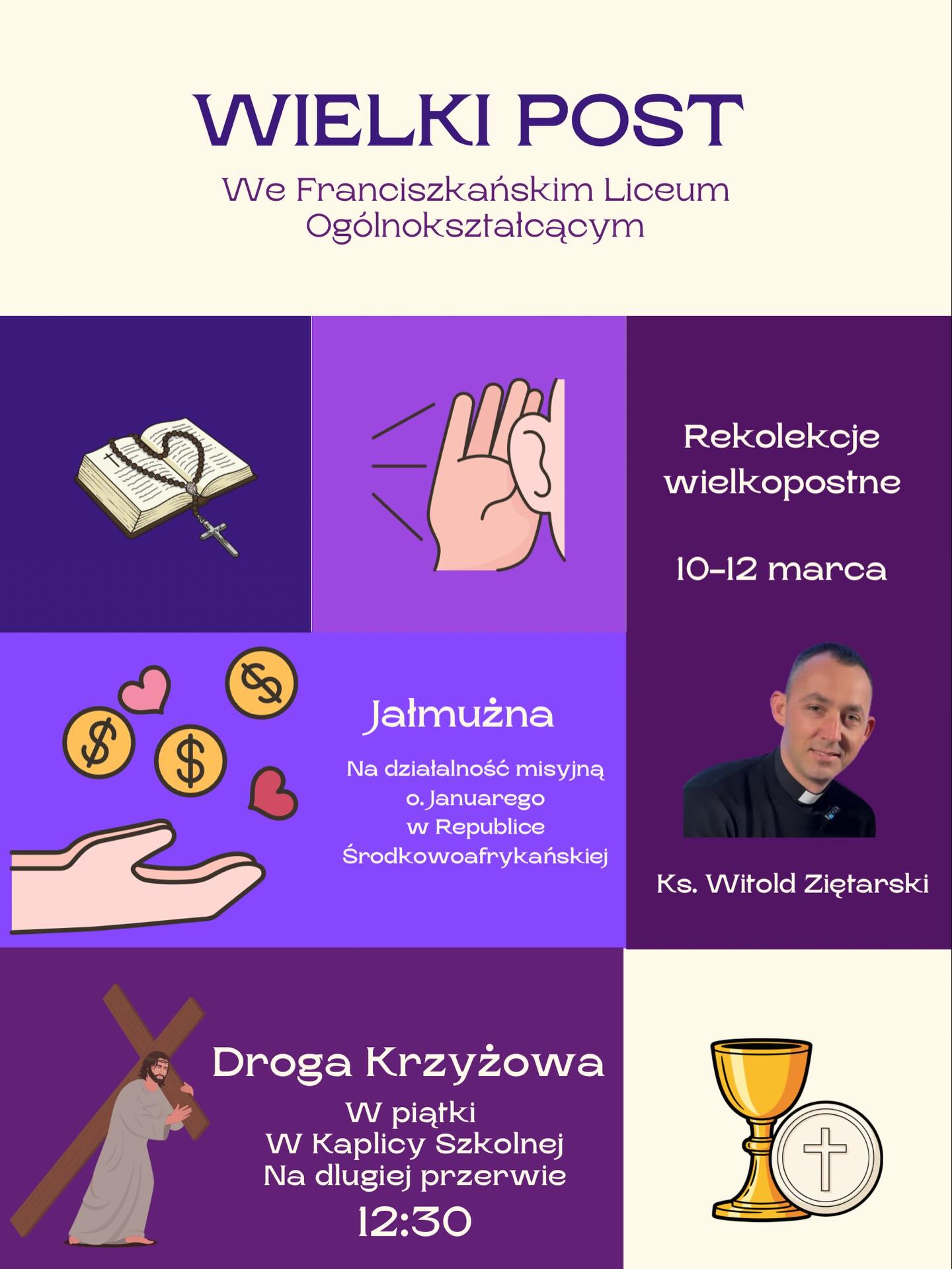 Zachęcamy do uczestnictwa w nabożeństwie Drogi Krzyżowej, która odprawiana będzie w naszej szkolnej kaplicy we Franciszkańskim Liceum Ogólnokształcącym w Toruniu, podczas piątkowej długiej przerwy o 12:30. To niezwykła okazja, by spotkać się z Ukrzyżowanym podczas niesienia swojego krzyża.